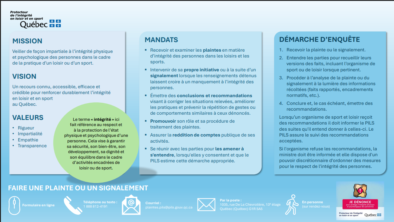 Advenant une problématique quant à l'Intégrité physique et psychologique des personnes lorsqu'elles pratiquent un loisir ou un sport, il est possible de dénoncer une situation au Protecteur de l'Intégrité en loisir et en sport (PILS)